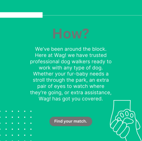 “We’ve been around the block. Here at Wag! we have trusted professional dog walkers ready to work with any type of dog. Whether your fur-baby needs extra assistance, a stroll through the park, or an extra pair of eyes to watch where they’re going, Wag! has got you covered. #FindYourMatch #WalkWithWag”
